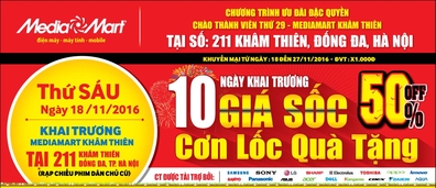 Ngày 18/11/2016, MediaMart sẽ chính thức đưa vào hoạt động siêu thị thứ 29- MediaMart Khâm Thiên tại 211 Khâm Thiên, Đống Đa, Hà Nội.  Để chào mừng sự kiện đặc biệt này, Media Mart mang đến chương trình “10 ngày Giá sốc cơn lốc quà tặng”.