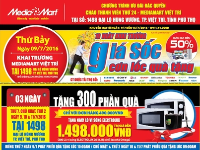 Ngày 9/7/2016, MediaMart sẽ chính thức đưa vào hoạt động siêu thị thứ 24- MediaMart Việt Trì tại 1498 Đại lộ Hùng Vương, tp Việt Trì, Phú Thọ.  Để chào mừng sự kiện đặc biệt này, Media Mart mang đến chương trình “10 ngày Giá sốc cơn lốc quà tặng”.