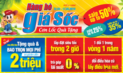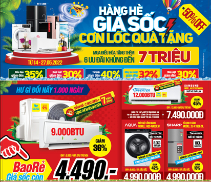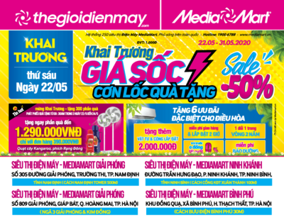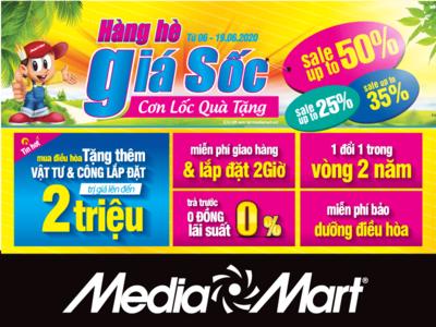 Tháng 5 này MediaMart rộn ràng khuyến mại cực lớn trong chương trình "Hàng hè giá sốc - Cơn lốc quà tặng" vì quyền lợi người tiêu dùng giảm lớn đến 50%. Chương trình áp dụng từ ngày 6/5 đến hết ngày 3/6 tại các trung tâm thuộc hệ thống siêu thị điện máy MediaMart toàn quốc. Chương trình với loạt ưu đãi lớn như: Điều hòa giảm đến 35%, quạt mát giảm đến 30%, tivi, tủ lạnh giảm đến 40%, gia dụng giảm đến 45%. Đặc biệt mua điều hòa tặng thêm 6 ưu đãi khủng đến 7,000,000đ.