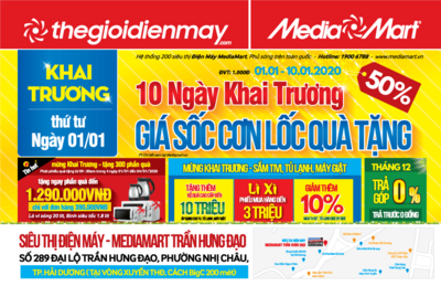Sáng thứ 4, ngày 1 tháng 1, tưng bừng khai trương Mediamart Trần Hưng Đạo - Số 289 Trần Hưng Đạo, Phường Nhị Châu, Hải Dương (Tại vòng xuyến Trần Hưng Đạo, Cách BigC 200 mét). Nhân dịp này, MediaMart Trần Hưng Đạo mang đến 10 ngày khuyến mại cực sốc.