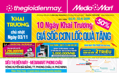 Sáng chủ nhật, ngày 3 tháng 11, tưng bừng khai trương siêu thị điện máy MediaMart Phong tại Phú Thọ. Nhân dịp này, MediaMart Phong Châu mang đến chương trình khuyến mại cực sốc trong 10 ngày đầu khai trương.