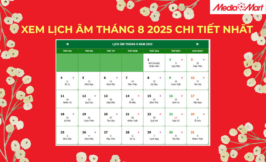 Những thông tin chi tiết nhất về lịch Âm tháng 8 2025, ngày tốt, ngày xấu trong tháng sẽ được MediaMart chia sẻ chi tiết trong bài viết này.