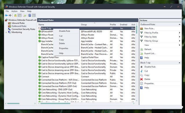 Cuối cùng, bạn có thể tìm tác vụ vừa lưu trong danh sách Outbound Rules. Trong trường hợp muốn xóa, bạn hãy nhấn chọn tác vụ rồi nhấn Delete hoặc có thể nhấn tạm ngưng Disable Rule.