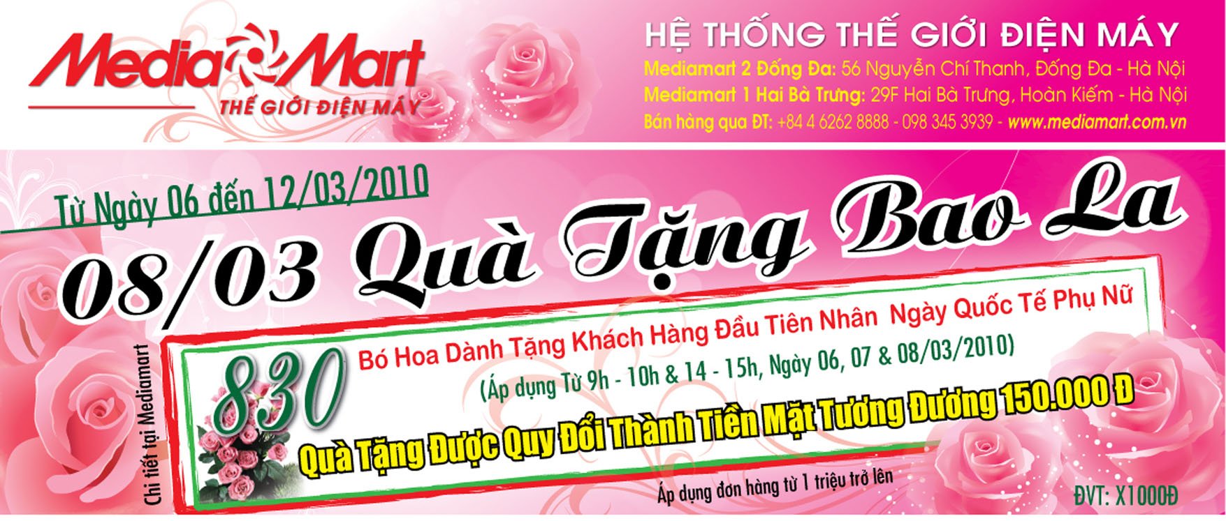 Trong 3 ngày từ ngày 06/03 đến hết 08/03 trong hai khung giờ vàng từ 09h đến 10h và 14h đến 15h, Thế giới điện máy Mediamart sẽ giành tặng 830 bó hoa trị giá 150.000 đồng đối với tất cả khách hàng mua đơn hàng từ 1 triệu đồng trở lên, đặc biệt phần quà này có thể quy đổi thành tiền mặt.