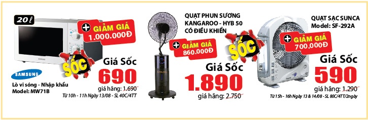 - Lò vi sóng Samsung MW71B, giá hãng 1.690.000đ, giảm 1.000.0000đ, giá sốc 690.000đ (chỉ bán từ 10h-11h, ngày 13/8).