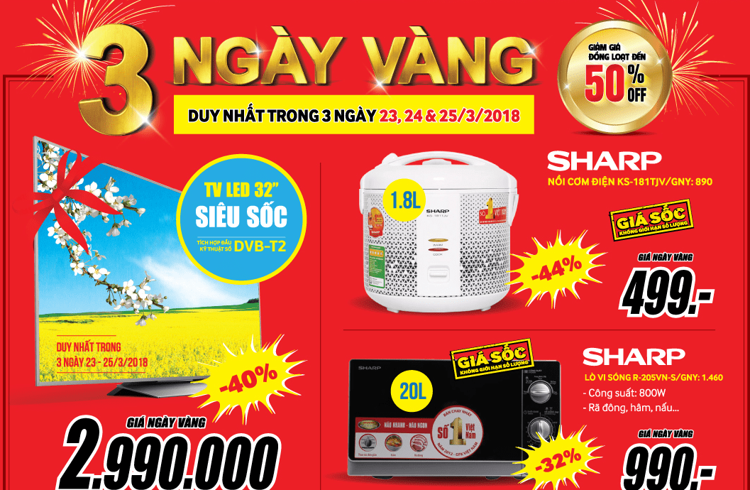 Cuối tháng 3 này, cùng với loạt khuyến mại các sản phẩm tivi, tủ lạnh, máy giặt giảm giá cực mạnh sau tết; chương trình đổi cũ lấy mới, đón đầu mùa nắng nóng - tặng 10.000 phiếu bảo dưỡng điều hòa … MediaMart tiếp tục mang đến triệu bất ngờ trong 3 ngày vàng mua sắm 23, 24 và 25/3/2018.