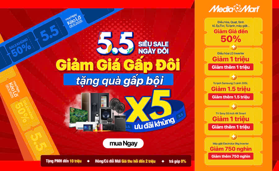 5/5 siêu sale ngày đôi, Media Mart mang đến cho Quý khách hàng ngàn deal sốc, giảm giá gấp đôi, quà gấp bội. Đây là cơ hội để bạn mua sắm các sản phẩm điện tử, điện lạnh, đồ gia dụng, laptop, điện thoại, phụ kiện công nghệ… với mức giá ưu đãi. Chương trình chỉ diễn ra trong ngày 5/5, đừng bỏ lỡ nhé!
