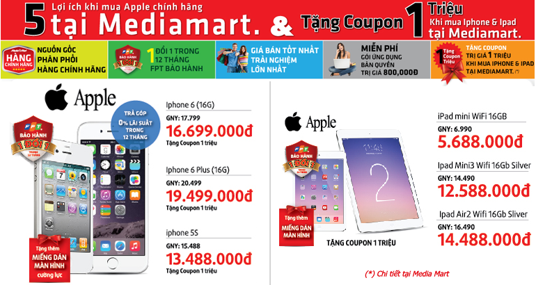 Đặc biệt trong thời gian này, từ 21/3 - 10/4/2015, Mediamart thực hiện CT Ưu đãi "5 Lợi ích khi mua các sản phẩm Apple chính hãng tại Media Mart" :
