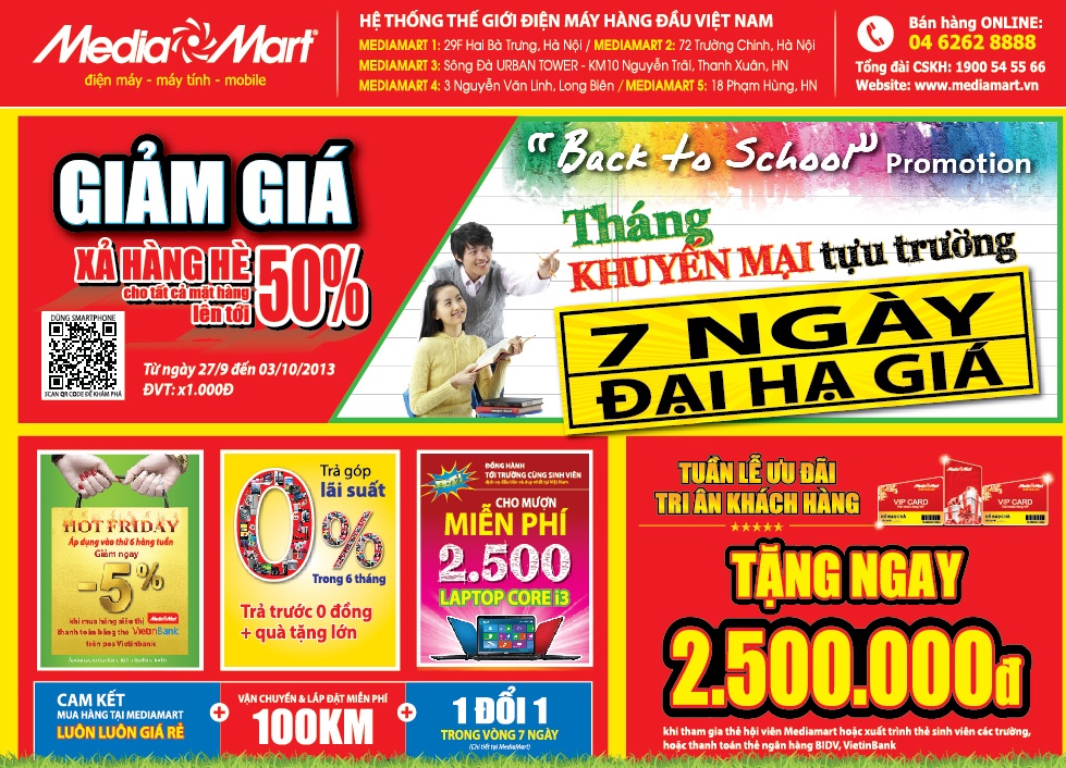 “7 ngày cao điểm đại hạ giá” nằm trong Tháng khuyến mại tựu trường 2013 chính thức được Thế giới điện máy Media Mart công bố trên toàn Hệ thống 5 siêu thị: 29F Hai Bà Trưng; 72 Trường Chinh; Km10 Nguyễn Trãi; 3 Nguyễn Văn Linh; 18 Phạm Hùng, Hà Nội.