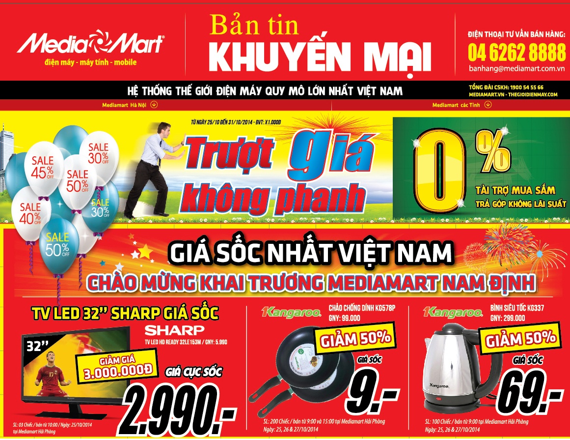 Đặc biệt chuẩn bị cho sự kiện chào mừng khai trương MediaMart Nam Định, MediaMart khởi động sớm với chương trình bán hàng giá cực sốc duy nhất trong 03 ngày 25,26,27/10 với chảo chống dính Kangaroo KG578P chỉ 9.000đ, bình siêu tốc Kangaroo KG337 chỉ 69.000 đồng, duy nhất ngày 25/10, TV LED Sharp 32’’ giá 2.990.000đ. Áp dụng duy nhất tại số 10 Lê Hồng Phong, Hải Phòng.