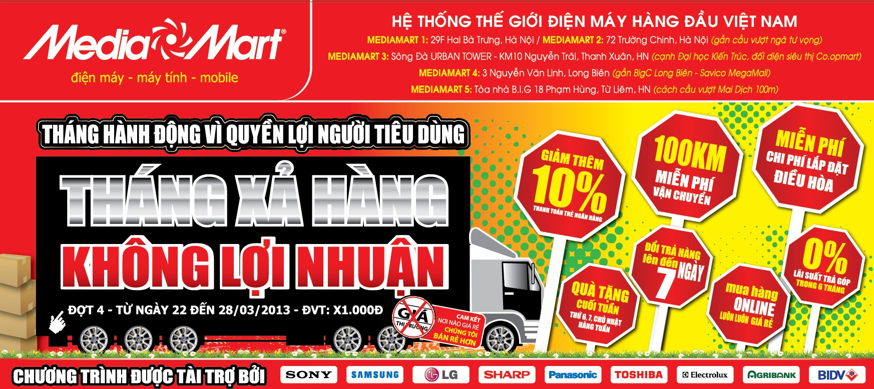 Diễn ra từ 22/3 đến hết 28/3, 7 ngày cuối cùng “Xả hàng không lợi nhuận” với tổng ngân sách hàng giảm giá, tặng quà lên tới hàng tỷ đồng chính thức được Hệ thống thế giới Media Mart công bố trên toàn Hệ thống 5 siêu thị: 29f Hai Bà Trưng; 72 Trường Chinh; Km10 Nguyễn Trãi; 3 Nguyễn Văn Linh; 18 Phạm Hùng, Hà Nội.