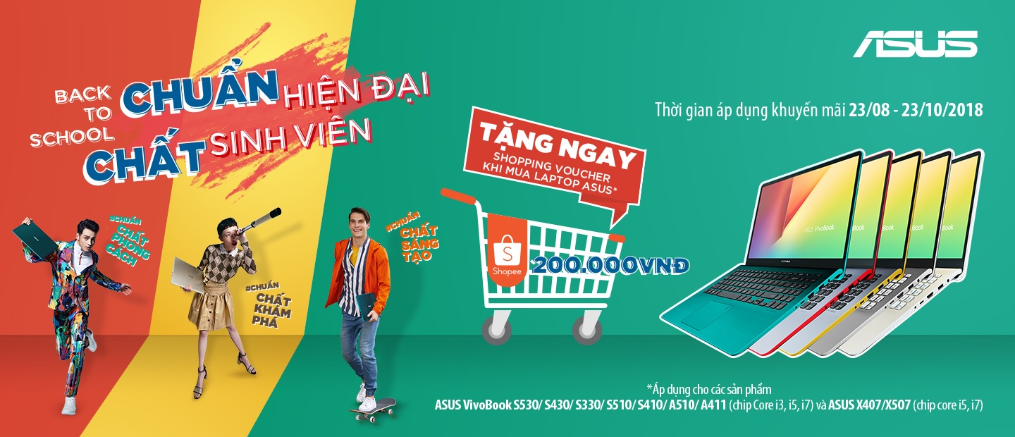 Chào đón năm học mới. Mediamart & Asus thực hiện CTKM Back to School: Chuẩn hiện đại – Chất sinh viên. Theo đó từ ngày 23/08/2018 đến ngày 23/10/2018, khi mua Laptop ASUS VivoBook (S530/ S430/ S330/ S510/ S410/ A510/ A411) trang bị chip Intel® Core™ i3/ i5/ i7 hoặc ASUS X507/ X407 trang bị chip Intel® Core™ i5/ i7 tại Mediamart, khách hàng sẽ được tặng một phiếu mua hàng Shopee trị giá 200,000 VNĐ