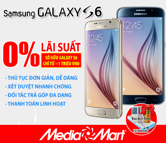 Sau khi công bố giá của Siêu phẩm Samsung Galaxy S6 và S6 Edge chính hãng ở Việt Nam, hiện tại Bộ đôi S6/ S6 Edge đã chính thức có mặt tại cácSiêu thị thuộc Hệ thống thế giới điện máy Media Mart trên toàn quốc. Khi mua Galaxy 6 chính hãng tại MediaMart, quý khách hoàn toàn yên tâm về chất lượng hàng hóa 100% chính hãng, không những thế là khách hàng còn được hưởng hàng loạt ưu đãi quà tặng cũng như các ưu đãi, các tiện ích tốt nhất về dịch vụ. Đặc biệt, thật khó tin nhưng ngay từ bây giờ, bạn đã có thể sở hữu Galaxy S6 hay những siêu phẩm khác chỉ từ hơn 1 triệu đồng.