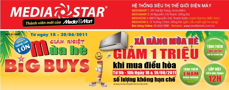 Từ ngày 18/6 đến 30/6/2011, tại 04 đại siêu thị của Media Mart: Media Mart 1 (29F Hai Bà Trưng), Media Mart 2 (56 Nguyễn Chí Thanh), Media Star 3 (Km10 Nguyễn Trãi, Thanh Xuân) và Media Star 4 (72 Trường Chinh), sẽ diễn ra 03 chương trình bán hàng cực hấp dẫn.
