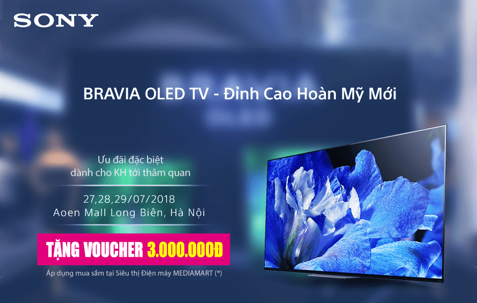 Trong 3 ngày vàng từ 27/7-29/7/2018, Khách hàng tham gia lễ hội Sony RoadShow "Bravia OLED TV - Đỉnh cao Hoàn Mỹ Mới" tại AEON Long Biên sẽ được tặng Voucher giảm giá, Khách hàng sử dụng Voucher giảm giá này để mua sản phẩm Tivi Bravia tại hệ thống các siêu thị điện máy của MediaMart trên toàn quốc (Voucher có giá trị sử dụng đến hết 05/8/2018).