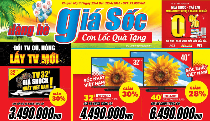 Tâm điểm là chương trình Đổi TV cũ, hỏng lấy TV mới. Theo đó, dòng TV LED 32’’ có giá đổi cũ rẻ chưa từng có chỉ 3.490.000đ, TV LED 40’’ Sharp 40LE275X giảm 28% còn 6.490.000đ… Mua TV trong đợt này, tùy theo model và size màn hình, khách hàng còn nhận được quà tặng thiét thực như quạt cây cao cấp, máy xay sinh tố hay nồi cơm điện…