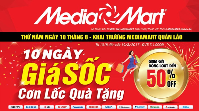 Cũng nhân dịp này, MediaMart sẽ triển khai 1 chương trình Giảm giá trên quy mô lớn, dài ngày trên toàn hệ thống đến hết 19/8 với hàng ngàn mặt hàng TV LED, điều hòa, quạt, tủ lạnh, smartphone, laptop… chính hãng với mức giảm giá đến 50%: Cụ thể: TV LED 32’’ giá cực sốc 3.490.000đ; điều hòa 1 chiều 9000BTU giá rẻ chưa từng có chỉ 4.690.000đ tặng thêm bộ quà trị giá 750.000đ; điều hòa 1 chiều 10.000BTU inverter giảm 25% giá khai trương chỉ 6.490.000đ tặng bộ quà trị giá 850,000đ; tủ lạnh 165l Sharp SJ-16VF4-WMS giảm 24% còn 3.990.000đ, máy giặt lồng ngang giá ngang lồng đứng chỉ 3.690.000đ tặng thêm quà, quạt phun sương Comet CM8816 giảm 49% còn 999.000đ, máy xay sinh tố Kangaroo KG-302 giảm 38% còn 269.000đ…