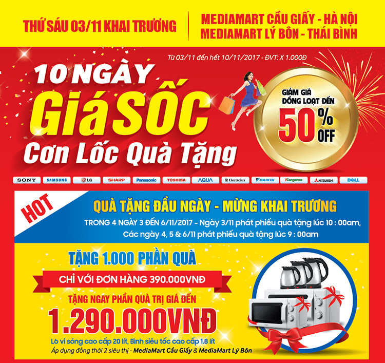 Chưa dừng ở đó, trong suốt 10 ngày khai trương, khi mua TV, tủ lạnh, máy giặt, điều hòa tại MediaMart khách hàng còn được hưởng trọn ưu đãi khuyến mại, tặng thêm phiếu mua hàng trị giá 500.000đ vào giờ vàng mua sắm từ 11-12h các ngày….