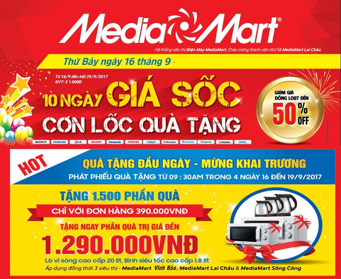 Sáng 16/9/2017, MediaMart sẽ đồng loạt khai trương thêm 03 siêu thị mới MediaMart Vĩnh Bảo tại khu phố 3/2, thị trấn Vĩnh Bảo, huyện Vĩnh Bảo, TP. Hải Phòng (cách bờ hồ 100m về phía Cầu Tây), MediaMart Lai Châu tại tổ 9 phường Tân Phong, TP. Lai Châu (cạnh tòa án nhân dân tỉnh Lai Châu) và MediaMart Sông Công tại lô 98 đường Cách mạng tháng tám, tổ 10 phường Thắng Lợi, TP. Sông Công, Thái Nguyên (cách chợ Mỏ Chè 100m) Để chào mừng thành viên mới, Media Mart mang đến sự kiện khuyến mại cực lớn mang tên “Giá sốc cơn lốc quà tặng”.