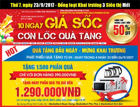 Nhân dịp này khai trương 4 siêu thị mới, MediaMart mang đến chương trình khuyến mại gấy sốc bằng chuỗi 10 ngày "Giá sốc cơn lốc quà tặng”. Theo đó, chỉ với đơn hàng từ 390.000 đồng, 2000 khách đầu tiên của MediaMart trong 04 ngày vàng chào mừng khai trương sẽ nhận được ngay phần trị giá đến 1.290.000đ đồng gồm Lò vi sóng Sharp 20 Lít hay Bình siêu tốc cao cấp 1.8 Lít.