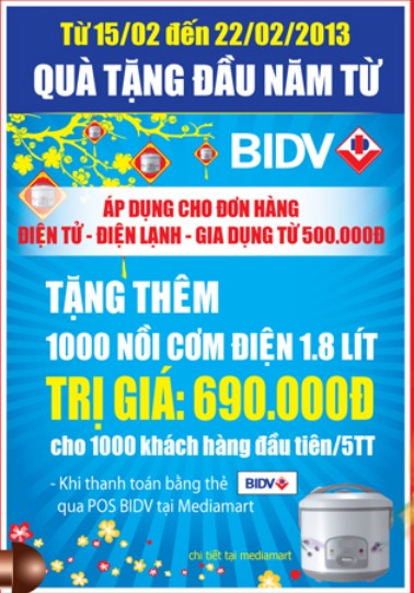 Từ 15/2 đến 23/2, 1000 chủ thẻ BIDV đầu tiên mua sắm tại Media Mart có giá trị đơn hàng từ 500.000đ trở lên sẽ nhận ngay Nồi cơm điện 1,8l trị giá 690.000đ. 2000 khách hàng đầu tiên có đơn hàng từ 990.000đ nhận ngay bình siêu tốc 490.000đ