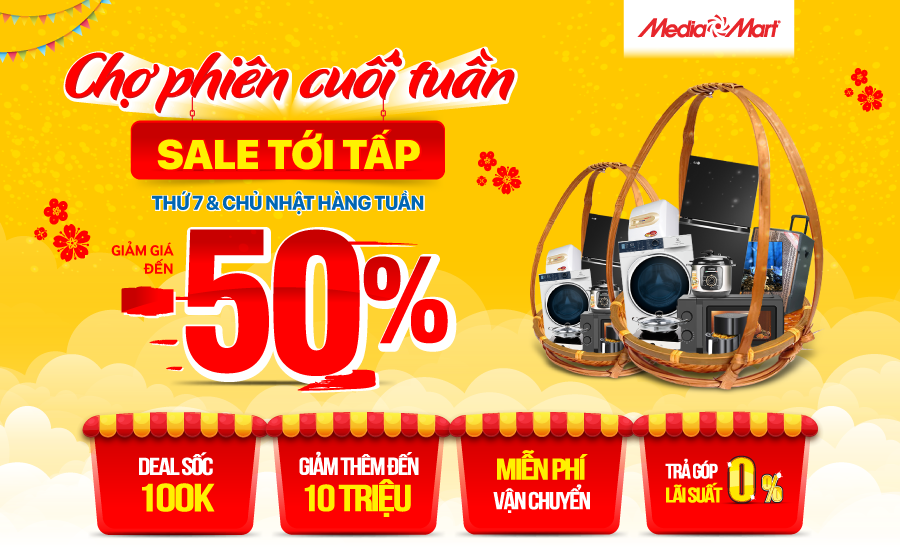 Nhằm đáp ứng nhu cầu mua sắm dịp cuối năm, MediaMart triển khai chương trình ưu đãi đặc biệt “Chợ phiên cuối tuần” với hàng ngàn sản phẩm điện máy, công nghệ giảm giá lên tới 70%. Chương trình diễn ra duy nhất trong 2 ngày cuối tuần 20 & 21/1/2024. Cơ hội để bạn thỏa sức mua sắm mà không lo về giá. Chốt đơn ngay!