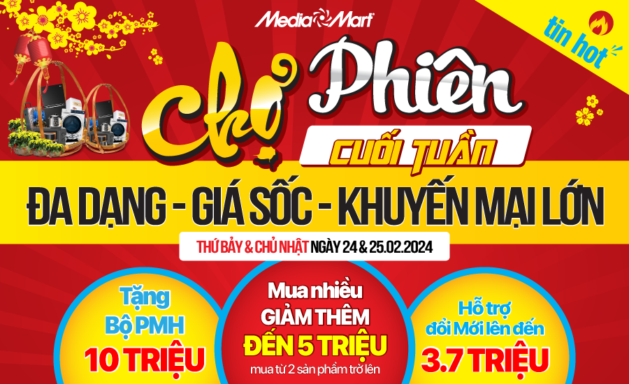 Theo đó, quý khách hàng có thể mua sắm trong chương trình “Chợ phiên cuối tuần” diễn ra duy nhất  24 & 25/2/2024 tại các hệ thống siêu thị MediaMart. Chi tiết chương trình khuyến mại tại: https://mediamart.vn/sale-cuoi-tuan