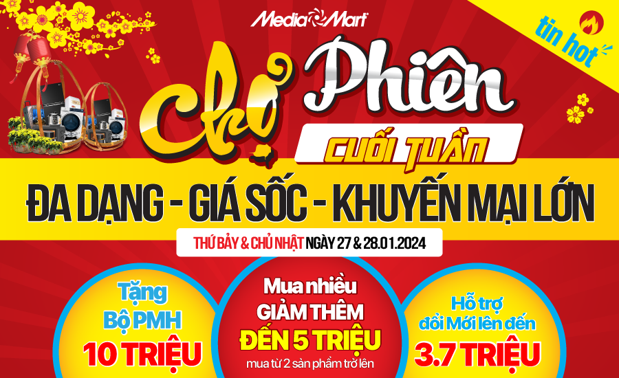 Theo đó, quý khách hàng có thể mua sắm trong chương trình “Chợ phiên cuối tuần” diễn ra duy nhất 13 & 14/01/2024 tại các hệ thống siêu thị MediaMart. Chi tiết chương trình khuyến mại tại: https://mediamart.vn/sale-cuoi-tuan