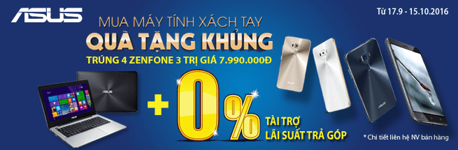 Theo thể lệ của chương trình, trong suốt thời gian diễn ra CTKM, với mỗi hóa đơn mua Laptop ASUS  bất kỳ trong khoảng thời gian từ ngày 17/09/2016 đến hết ngày 15/10/2016, sẽ được tham gia vào chương trình này. Theo đó, với mỗi hóa đơn mua sản phẩm Laptop ASUS bất kỳ, khách hàng sẽ nhận được 1 Phiếu rút thăm may mắn để có cơ hội trúng thưởng điện thoại Asus Zenfone 3.