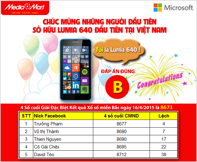 Sau gần 2 tuần diễn ra Mini Game Đoán Đúng Trúng DẾ xịn - Lumia 640" tại Media Mart ! (từ 7/4 - 16/4/2015) vô cùng sôi động và hào hứng với hàng nghìn lượt trổ tài comment dự đoán trên Fanpage MediaMart, BTC đã tìm ra 5 người chơi may mắn nhất được sở hữu 5 chiếc Smartphone Lumia 640 đầu tiên tại Việt Nam.