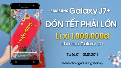 Giảm ngay 1.000.000 đồng khi mua điện thoại Galaxy J7+ với mã ưu đãi trên ứng dụng Quà tặng Galaxy. Mã ưu đãi dành riêng cho khách hàng đang sở hữu sản phẩm điện thoại thông minh Samsung Galaxy chính hãng
