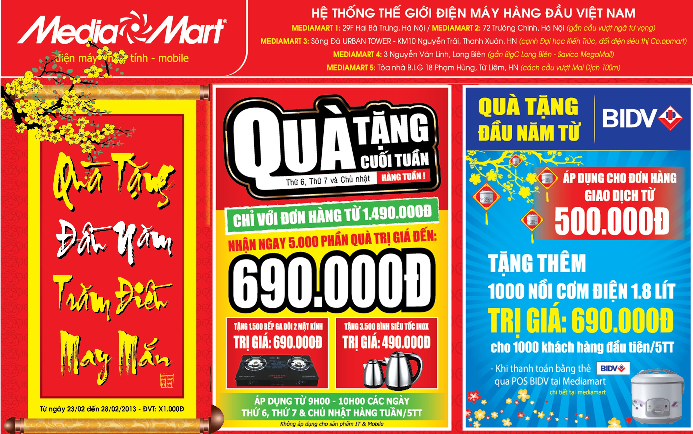 Tặng 5000 bếp ga đôi, bình siêu tốc trị giá tới 690.000đ cho hóa đơn từ 1.490.000đ, tặng 1000 nồi cơm điện trị giá 690.000đ cho hóa đơn từ 500.000đ thanh toán qua thẻ BIDV, lì xì tiền mặt lên tới 1,8 tỷ đồng… Media Mart mang đến cho khách hàng cơ hội cuối cùng nhận hàng ngàn quà tặng hấp dẫn trong dịp đầu xuân Quý Tỵ 2013.