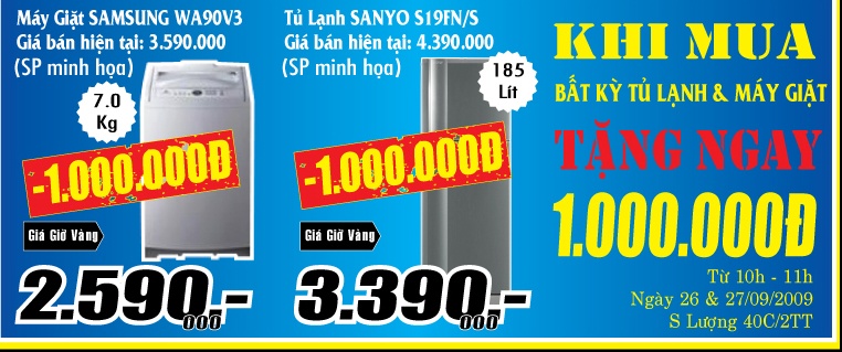 • Đặc biệt tại gian hàng điện lạnh cũng tặng ngay 1 triệu đồng cho tất cả khách hàng khi mua bất kỳ tủ lạnh & máy giặt nào trong khung giờ từ 10h-11h ngày 26 & 27/09/2009.