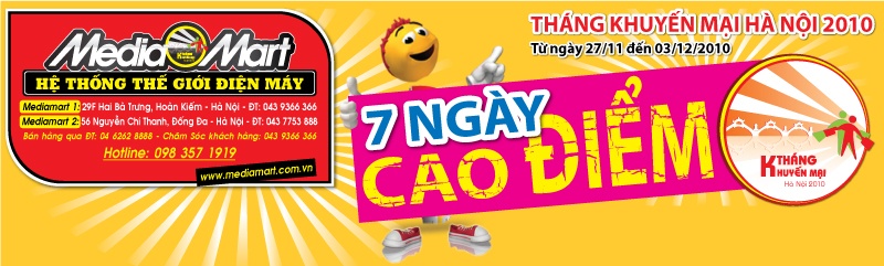 Chưa đầy một tuần nữa, tháng khuyến mại Hà Nội 2010 sẽ khép lại. Cam kết với Sở Công thương song hành cùng tháng khuyến mại, từ ngày 27/11 đến ngày 03/12/2010, Hệ thống siêu thị điện máy Media Mart tổ chức chương trình “7 ngày cao điểm cuối tháng” tại số 29F Hai Bà Trưng và 56 Nguyễn Chí Thanh.