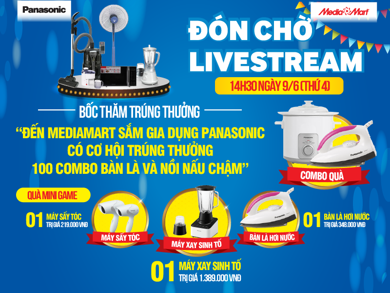MediaMart trân trọng thông báo chương trình quay số trúng thưởng “Đến MediaMart sắm gia dụng Panasonic, có cơ hội trúng thưởng 100 combo bàn là và nồi nấu chậm Panasonic trị giá đến 224.000.000VNĐ” sẽ diễn ra vào 14h30 ngày 9/6/2021 tại Công ty CP MediaMart Việt Nam - Tầng 8 - Tòa nhà MediaMart - Số 29F Hai Bà Trưng, Hoàn Kiếm, Hà Nội, hoặc xem trực tiếp trên fanpage: https://www.facebook.com/DienmayMediaMart.
