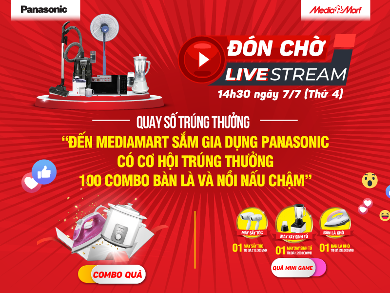 MediaMart trân trọng thông báo chương trình quay số trúng thưởng “Đến MediaMart sắm gia dụng Panasonic, có cơ hội trúng thưởng 100 combo bàn là và nồi nấu chậm Panasonic trị giá đến 224.000.000VNĐ” sẽ diễn ra vào 14h30 ngày 7/7/2021 tại Công ty CP MediaMart Việt Nam - Tầng 8 - Tòa nhà MediaMart - Số 29F Hai Bà Trưng, Hoàn Kiếm, Hà Nội, hoặc xem trực tiếp trên fanpage: https://www.facebook.com/DienmayMediaMart