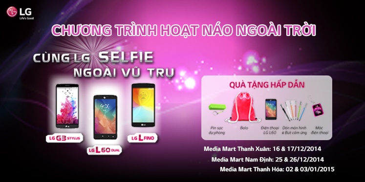 Lần đầu tiên xuất hiện tại Việt Nam, LG gửi đến các bạn trẻ cơ hội thực hiện "Điều - không - tưởng" trên. Đừng bỏ lỡ hành trình "Phi thuyền vũ trụ" Selfie của LG trong thời gian từ 16/12/2014 - 3/1/2014 với điểm đến của hành chình lần lượt là MediaMart Thanh Xuân, MediaMart Nam Định và MediaMart Thanh Hóa.