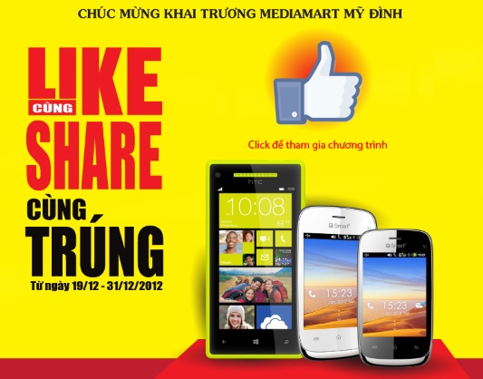 Với thao tác cực kỳ đơn giản, chỉ cần Like fanpage Media Mart tại địa chỉ https://www.facebook.com/DienmayMediaMart , truy cập ứng dụng “Cùng like – cùng share – cùng trúng lớn”. Link ứng dụng: https://www.facebook.com/DienmayMediaMart?sk=app_246361415493429) để up ảnh, tag bạn bè, kêu gọi like là cơ hội rinh về những giải thưởng giá trị đã ở trong tầm tay của bạn.
