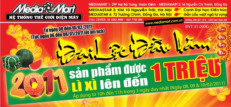 Mừng Xuân Tân Mão, Công ty CP Media Mart Việt Nam kính chúc quí khách hàng cùng toàn thể gia đình một năm mới an khang, thịnh vượng! Nhân dịp đầu năm, Media Mart xin gửi tới quí khách hàng chương trình khuyến mại: “Đại lộc đầu năm, trăm điều may mắn” từ ngày 08/02 đến hết ngày 10/02/2011 (tức mùng 6, mùng 7, mùng 8 Tết Âm lịch).