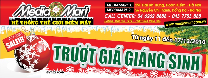 Ngày lễ Giáng sinh đến gần kề, phố phường nhộn nhịp. Dòng người qua lại tấp nập, tranh thủ thời gian mua sắm. Ai cũng muốn trang hoàng nhà cửa thật đẹp để đón giáng sinh. Còn bạn muốn là ông già Noel đem đến điều bất ngờ dành tặng cho những người yêu thương trong ngày lễ an lành. Bạn sẽ mua một món quà thật độc đáo và thiết thực tặng người thân như một chiếc điện thoại di dộng, máy tính xách tay, hay máy giặt, lò vi sóng,… để gia đình dùng trong mùa lạnh…. Nhưng giá cả của những món đồ đó khiến bạn phải suy nghĩ. Hiểu được sự trăn trở đó, thế giới điện máy Media Mart sẽ hỗ trợ bạn bằng chương trình khuyến mại: “Trượt giá Giáng sinh”. Chương trình sẽ diễn ra từ ngày 11 đến 17/12/2010 tại 29F Hai Bà Trưng và 56 Nguyễn Chí Thanh.