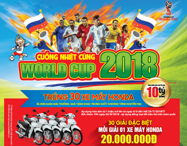 Chào mừng mùa World Cup 2018, từ 09/06 đến 29/07/2018 MediaMart mang đến chương trình “Cuồng nhiệt cùng Worldcup 2018”, theo đó trong thời gian diễn ra CTKM, khi mua hàng điện máy, công nghệ, khách hàng sẽ có cơ hội trúng 30 xe máy Honda & hơn 8000 giải thưởng hấp dẫn khác với tổng ngân sách khuyến mại lên đến hơn 10 tỷ đồng.