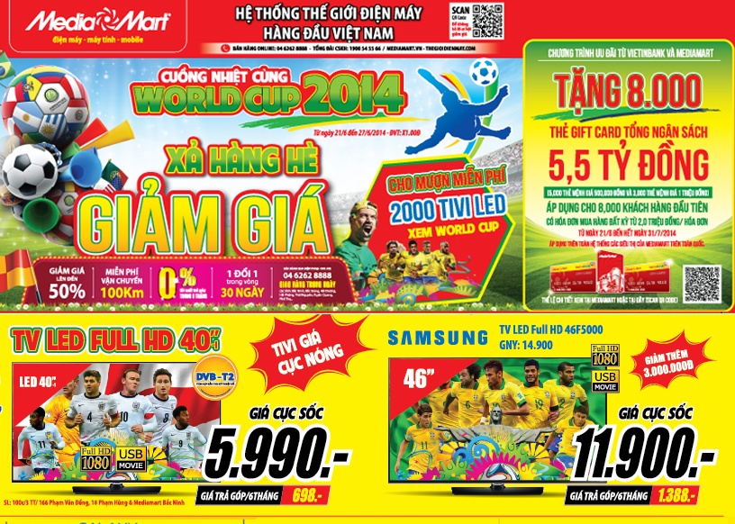 Cũng trong thời gian này, từ 21/6 đến 27/6, “nóng” cùng giải bóng đá lớn nhất hành tinh, MediaMart tiếp tục cho mượn miễn phí 2000 TV LED xem bóng đá. Chưa dừng ở đó, MediaMart hợp tác với các hãng điện tử hàng đầu thế giới kỳ vọng thiết lập giá đáy mới trên thị trường bán lẻ TV đồng thời tạo nên chương trình kích cầu tiêu dùng lớn nhất cho mùa Worlcup 2014 thông qua chiến dịch tài trợ giá sâu hàng loạt model TV size lớn HOT nhất hiện nay: TV LED Full HD 39’’ giá cực sốc 5.990.000 đồng, TV LED 40’’ Full HD Samsung 40H5100 giảm 3.3 triệu còn 8.590.000 đồng, TV LED 46’’ Full HD Samsung 46F5000 giảm 3 triệu còn 11.900.000 đồng…