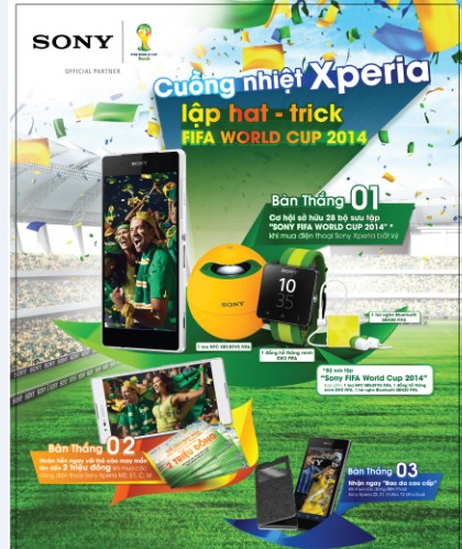 Khách hàng mua điện thoại Sony Xperia bất kỳ sẽ có cơ hội trúng 1 trong 28 bộ sưu tập “Sony FIFA Worldcup 2014” gồm 01 loa NFC SRC-BTV5 FIFA, 1 đồng hồ thông minh SW2 FIFA, 1 tai nghe Bluetooth SBH20 FIFA