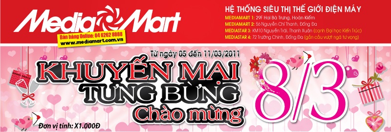 Nắm bắt được tâm lý này, Thế giới điện máy Media Mart đã chuẩn bị một chương trình bán hàng đặc biệt với thông điệp Tôn Vinh Người Phụ Nữ. Chương trình bắt đầu từ 05/03 đến hết 11/3/2011 tại Media Mart 1: 29F Hai Bà Trưng; Media Mart 2: 56 Nguyễn Chí Thanh; Media Star 3: Km10 Nguyễn Trãi Thanh Xuân; Media Star 4: 72 Trường Chinh Hà Nội.