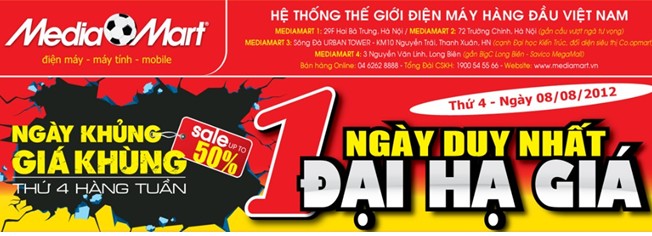 Duy trì chuỗi hoạt động bán hàng định kỳ mang lại nhiều lợi ích cho khách hàng với điểm nhấn tuần này là Đại tiệc LCD, LED, 3D giá sốc, Hệ thống siêu thị điện máy hàng đầu Việt Nam – Media Mart tham vọng sẽ phục vụ được khách hàng ngày càng tốt hơn và hiệu quả nhất.