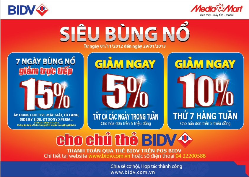 Công ty cổ phần Media Mart Việt Nam và Ngân hàng Thương mại Cổ phần Đầu tư và Phát triển Việt Nam (BIDV)  trân trọng cảm ơn sự quan tâm và ủng hộ của quý khách hàng đã mang lại thành công cho chương trình “Ưu đãi lớn với thẻ BIDV - Giảm thêm 15% khi mua sắm tại Media Mart ” trong thời gian vừa qua.