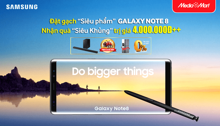 Siêu phẩm Samsung Galaxy Note 8 vừa chính thức ra mắt tối 23/8 tại New York và cũng sắp chính thức có mặt tại MediaMart với mức giá bán là 22.490.000đ kèm gói quà tặng khủng trị giá hơn 3 triệu đồng và Cơ hội trúng bộ quà samsung trị giá 100.000.000đ + Phiếu bốc thăm trúng trưởng 55 xe honda trị giá 1,100,000,000đ.