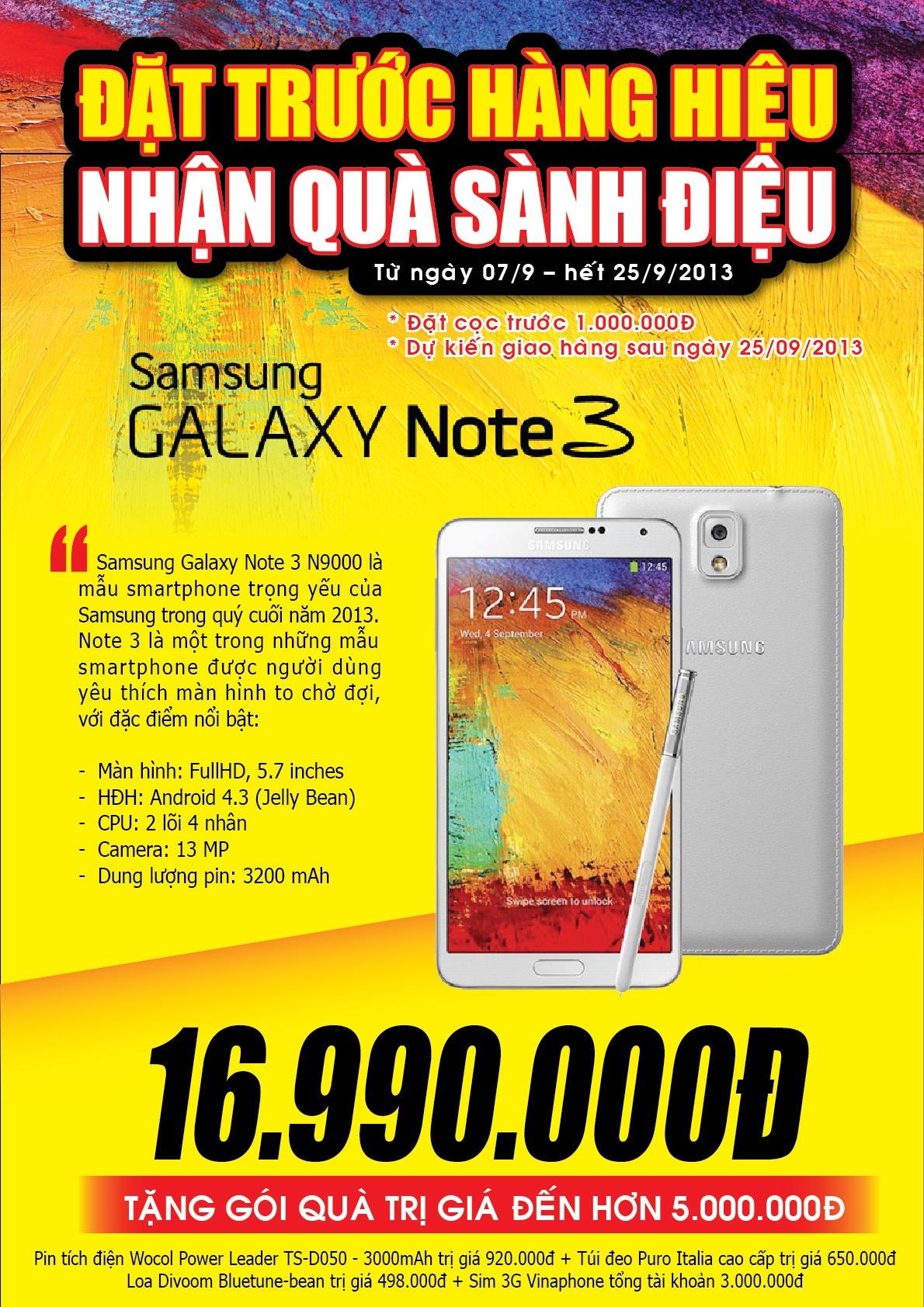 Siêu phẩm Galaxy Note 3 được đón đợi của Samsung sẽ có mặt tại Hệ thống Thế giới điện máy Media Mart trong tháng 9/2013 thông qua chương trình Đặt trước hàng hiệu- Nhận ngay sành điệu trị giá lên tới 5 triệu đồng do Media Mart phối hợp với Samsung thực hiện.