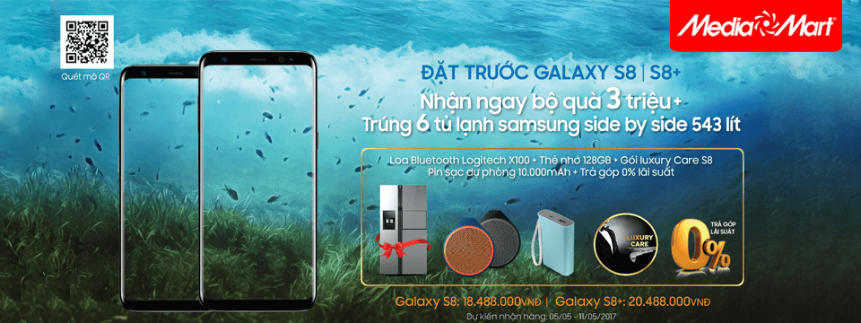 Bộ đôi siêu phẩm Samsung Galaxy S8 và S8+ sẽ chính thức có mặt tại MediaMart trong tuần đầu tháng 5/2017 với mức giá lần lượt là 18.488.000đ và 20.488.000đ kèm gói quà tặng khủng trị giá gần 4 triệu đồng và cơ hội trúng 06 Tủ lạnh Samsung Side by side 543 lít tổng trị giá đến 130 triệu đồng.