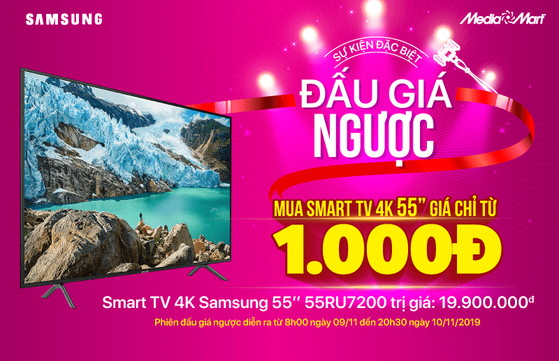 Trong phiên đấu giá ngược diễn ra từ 8h00 ngày 9/11/2019 đến 20h30 ngày 10/11/2019 tại Media Mart Long Biên, khách hàng có cơ hội mua SMART TV SAMSUNG 4K 55’’ 55RU7200 với mức giá thấp nhất. Khách hàng nhắn tin giá sản phẩm SMART TV SAMSUNG 4K 55’’ đến tổng đài chương trình. Hệ thống sau khi đóng sẽ lựa chọn ra mức giá thấp nhất và duy nhất để chọn ra khách hàng giành quyền mua sản phẩm mới mức giá đã trả.